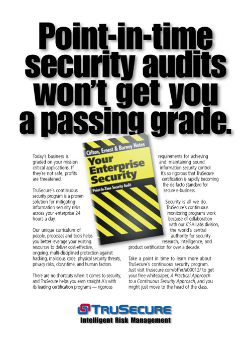 The ad did not win any contests, that wasn’t its purpose. It generated a successful wave of leads for TruSecure, making a difference in the client’s bottom line. We never intended to produce a “cliff” hanger… just measurable results.