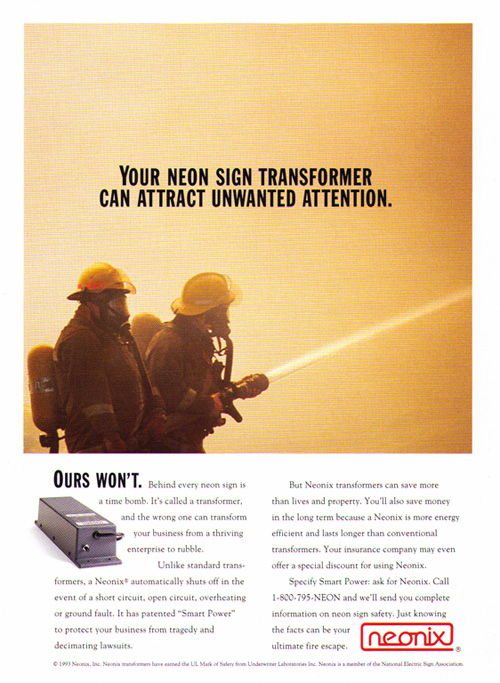 Neonix had patented a solid-state neon light transformer, dramatically reducing the hazard of accidental sparking. We wrote this ad to dramatically illustrate the hazard of not buying Neonix.